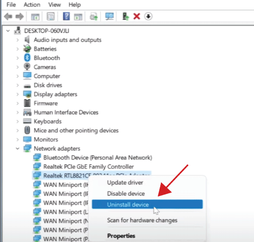 - Right-click your wireless adapter (Intel, Realtek, etc.) → Uninstall device.