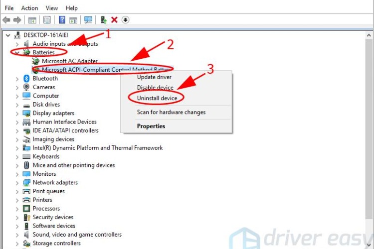 Batteries Section: Expand the “Batteries” category, right-click on “Microsoft ACPI-Compliant Control Method Battery,” and select “Update driver.”